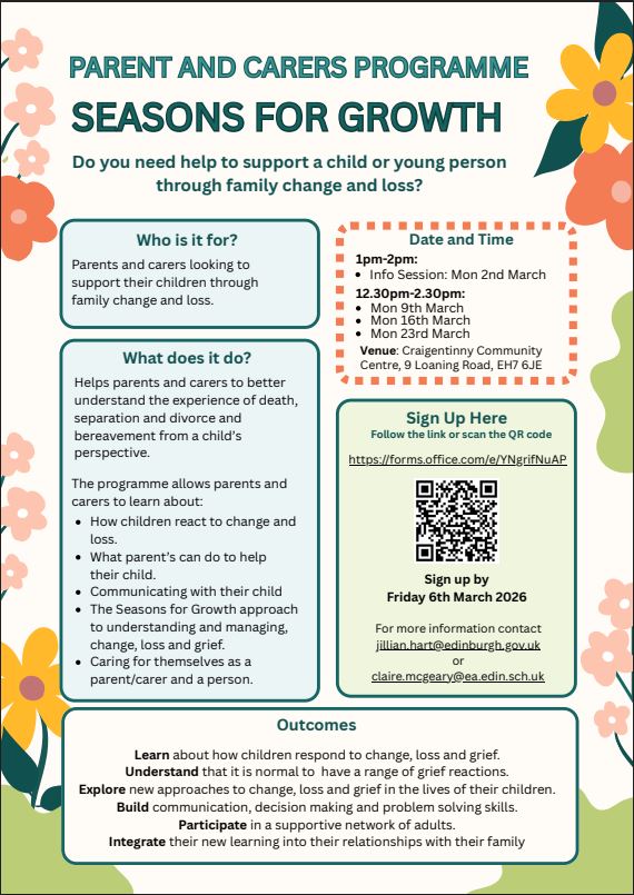 We are delighted to be able to offer the Seasons for Growth Programme to Parents and carers in the North East of Edinburgh.