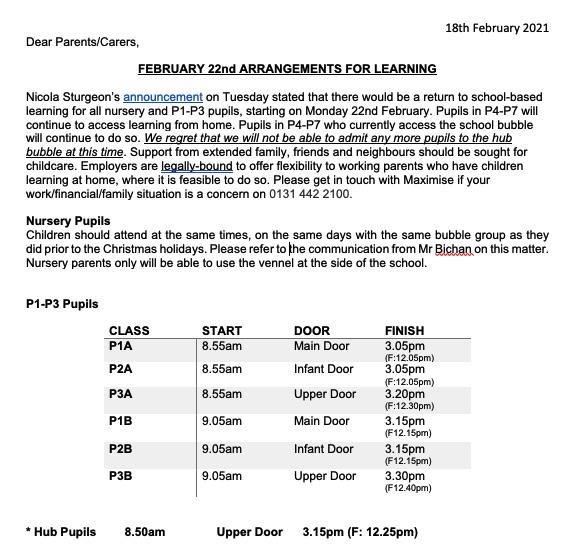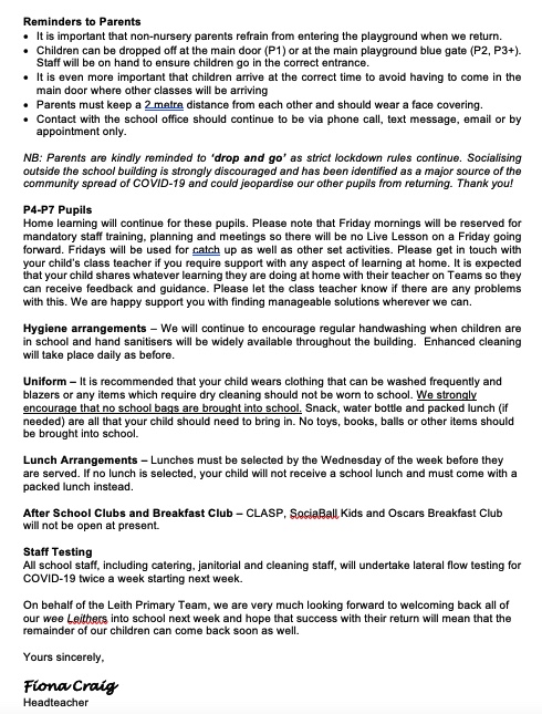 Letter from Headteacher re P1-P3 Pupils Return February 18, 2021 Ms Craig parents-letter-180221Download Discover more from Believe. Persevere. Achieve. Subscribe to get the latest posts sent to your email. Type your email… Subscribe Share this: Click to share on X (Opens in new window) X Click to share on Facebook (Opens in new window) Facebook Click to share on WhatsApp (Opens in new window) WhatsApp Click to email a link to a friend (Opens in new window) Email Click to print (Opens in new window) Print Like Loading... Related