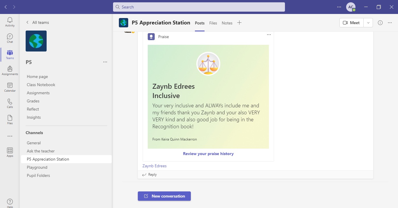 | Keira | Primary 5 | Keira shows great kindness to all and is very good at giving personal and detailed compliments and praise. She often shares on the class Appreciation Station Channel on Teams. Well done Keira 😊 |