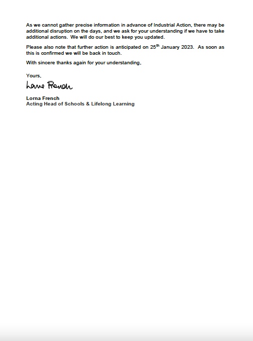 | 25/01/23 | Possible School Strike Day – Confirmation nearer the time |