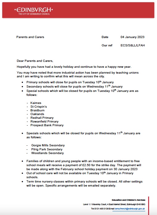 | 10/01/23 | Primary School Strike Day – All primary schools in Edinburgh will be closed on this day. Pupils should stay at home and undertake home learning. Details contained in letter emailed to parents. |