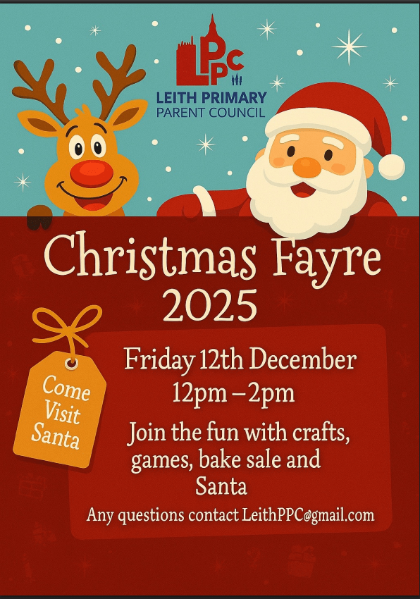 Leith Primary Parent Council is delighted to invite you to our annual Christmas Fayre. Come along and join the festive fun – there will be something for everyone.