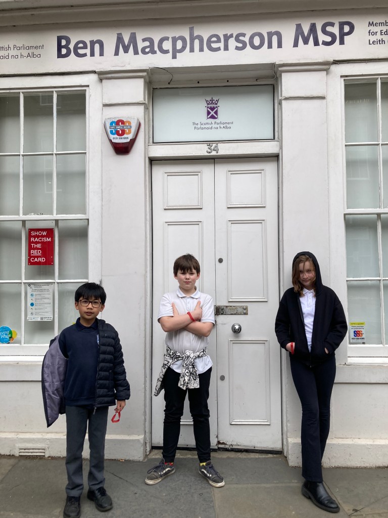 Well done to our Primary 5 pupils who delivered letters to local MSP Ben Macphearson. The letters provided an opportunity for the children to demonstrate their powers of written persuasion. Primary 5 asked Mr Macphearson to use his powers as an MSP to grant all children a day off school after the Scotland-Haiti football game at the World Cup. A few of the P5 children delivered the letters in person to Mr Macphearson’s office in Leith – accompanied by Ms Aitken. We will report back if they get a response to their request.