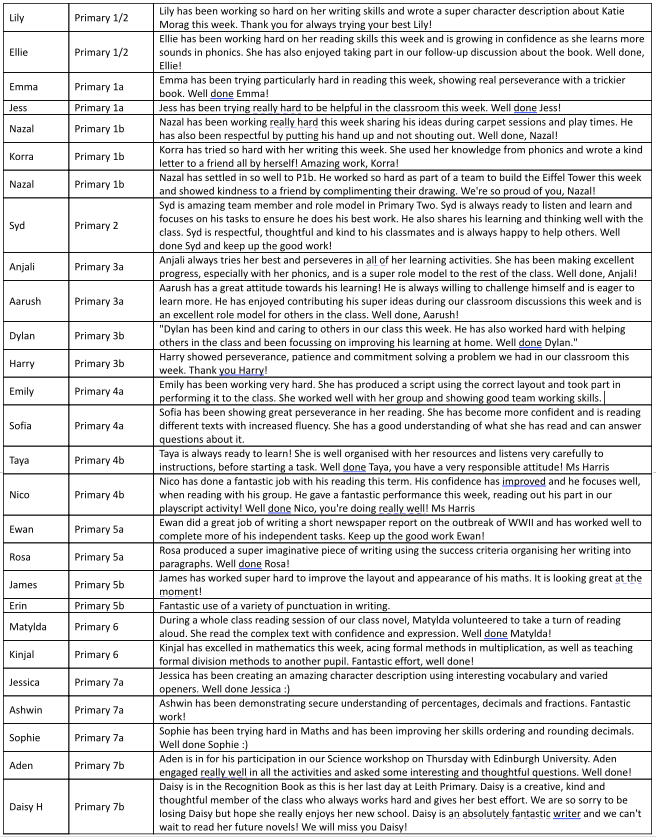 Today, we said farewell to Mrs Anna Hind who, on Monday, will take up a twenty-three month secondment as an Acting Principal Teacher at another primary school in Edinburgh. Mrs Hind, who has acted up twice as Leith Primary’s Principal Teacher, left with a handmade card signed by many former pupils who wished her good luck. Mrs Hind has contributed a huge amount to the success and development of Leith Primary School, not least with her support of pupil filmmaking, winning with her P7 class at the final of the School Mock Court trials and the attainment of three Eco Schools Award Green Flags. I would like to thank Mrs Hind for her enormous contribution to the school so far and wish her the very best for her secondment.